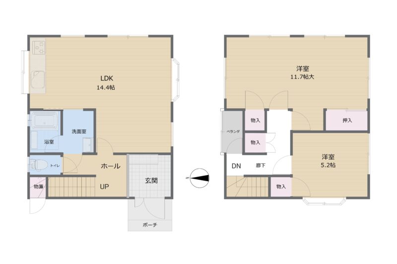 | 間取内容 | LDK 14.4畳 1階 1室 洋室 11.7畳 2階 1室 洋室 5.2畳 2階 1室 | ||